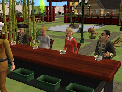 Another view of the sims eating with a view of the zen garden behind them.